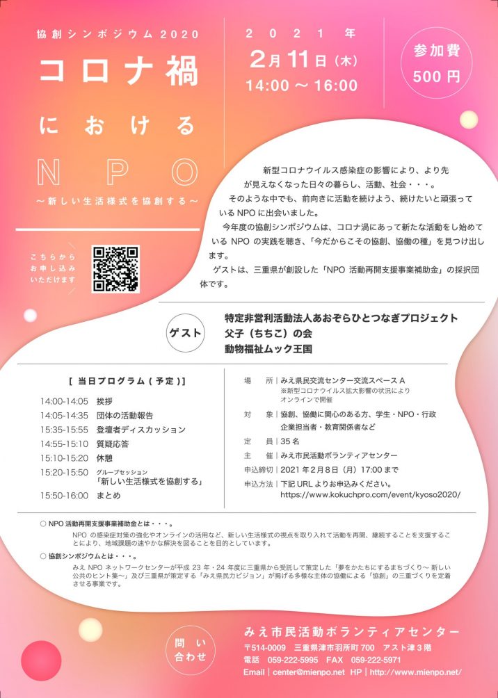 【開催概要】 日時:2021年2月11日(木)14:00~16:00 場所:みえ県民交流センター交流スペースA ※新型コロナウイルス拡大影響の状況によりオンライン で開催する場合があります 対象:協創、協働に関心のある方、学生・NPO・行政・企業担当者 教育関係者など ゲスト:特定非営利活動法人あおぞらひとつなぎプロジェクト 父子(ちちこ)の会 動物福祉ムック王国 定員:35名 参加費:500円 主催:みえ市民活動ボランティアセンター 申込締切:2021年2月8日(月)17:00まで 申込方法:下記URLよりお申込みください。 https://www.kokuchpro.com/event/kyoso2020/