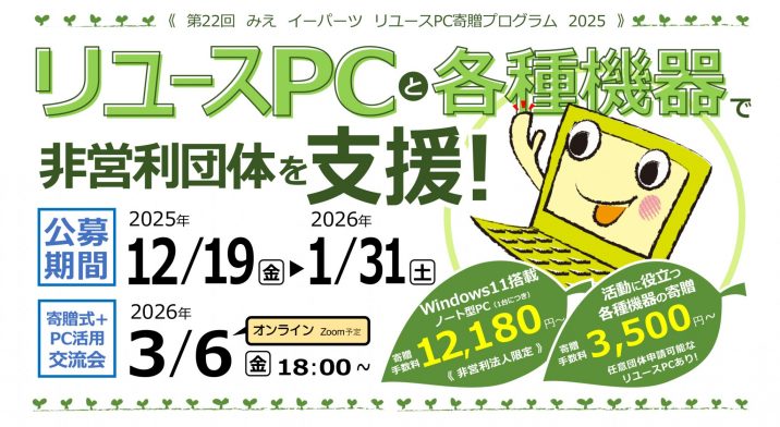 | タイトル | 【お知らせ】みえイーパーツリユースPC寄贈プログラム 2025 申請団体募集 |